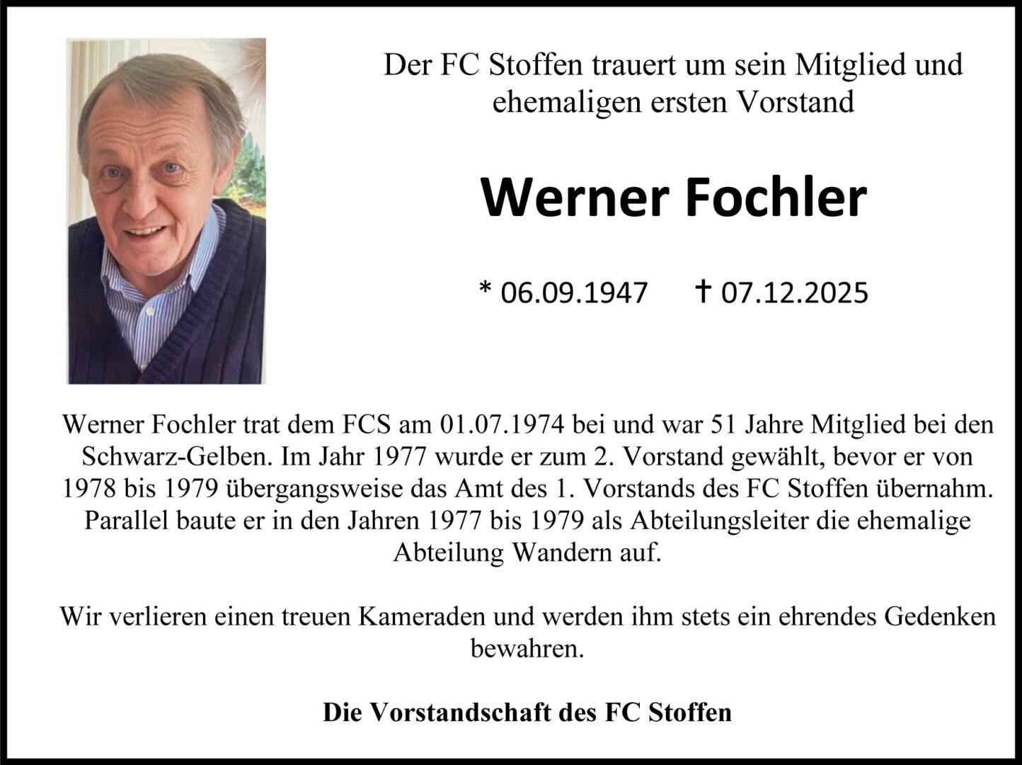Werner Fochler trat dem FCS am 01.07.1974 bei und war 51 Jahre Mitglied bei den Schwarz-Gelben. Im Jahr 1977 wurde er zum 2. Vorstand gewählt, bevor er von 1978 bis 1979 übergangsweise das Amt des 1. Vorstands des FC Stoffen übernahm. Parallel baute er in den Jahren 1977 bis 1979 als Abteilungsleiter die ehemalige Abteilung Wandern auf.